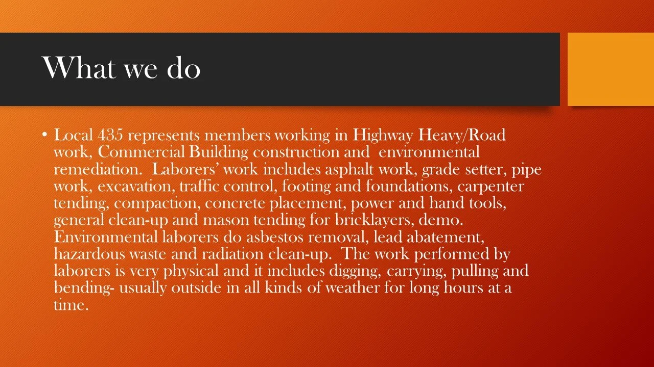 Construction laborers can be found on almost all construction sites performing a wide range of tasks from the very easy to the potentially hazardous. They can be found at building, highway, and heavy construction sites; residential and commercial sites; tunnel and shaft excavations; and demolition sites. Many of the jobs they perform require physical strength, training, and experience. While most construction laborers specialize in a type of construction, such as highway or tunnel construction, some are generalists who perform many different tasks during all stages of construction. Construction laborers, who work in underground construction, such as in tunnels, or in demolition are more likely to specialize only in those areas.